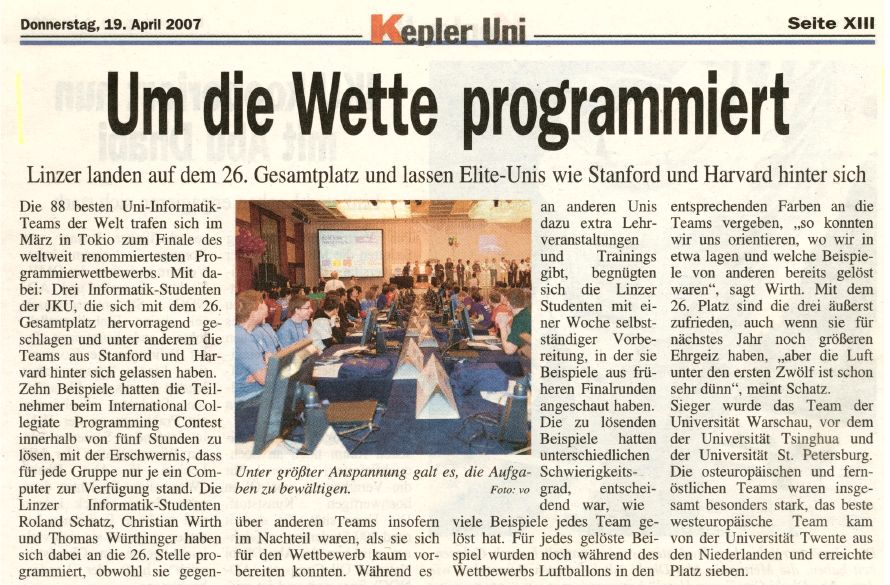 - JKU student team wins place 26 in the finals of the ACM Programming Contest in Tokyo (2007)